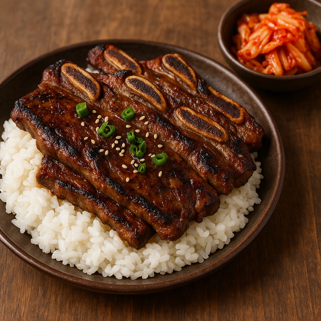 Each plate features tender, flavor-packed LA-style galbi, steamed white rice, and house-prepared kimchi.